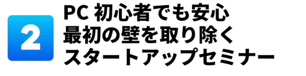 講師3名体制の個別指導、完全クローズドの個別ルーム、講師からの声かけサポート、全国リアルセミナー、オンラインセミナー。一人で悩む時間を、限りなくゼロに近づける。