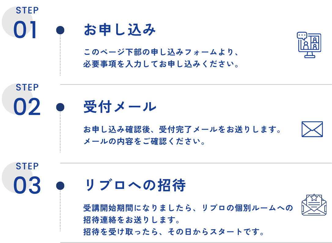 お申し込み後、受付完了メールをお送りします。受講開始期間になりましたら、リブロのSNSへの招待連絡をお送りします。招待を受け取ったその日から、スタートできます。申し込みから開始まで、あなたが自分で動く必要があるのはフォームへの入力だけです。